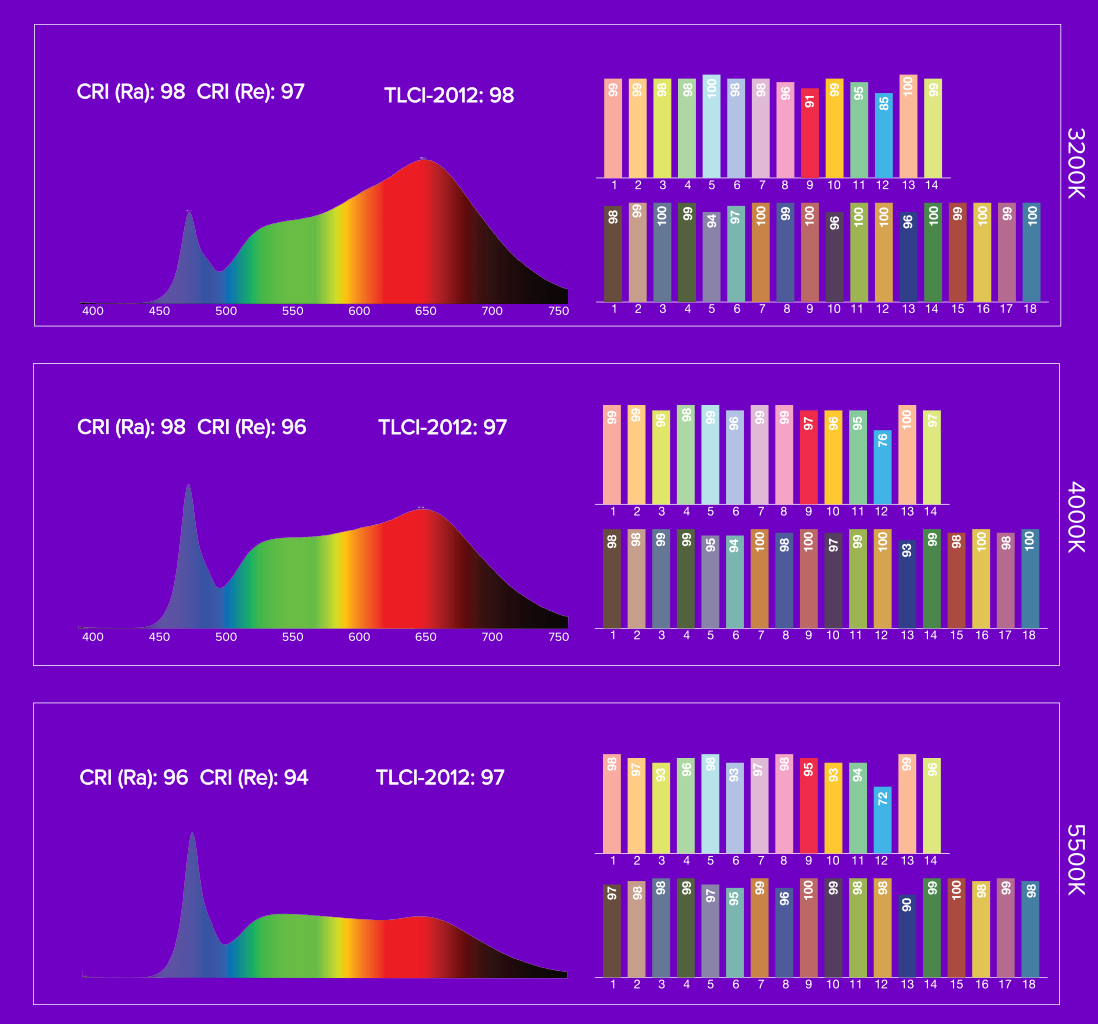 Individually calibrated lights lead to 100% color consistency and exact color reproduction of color temperature and filter gels.